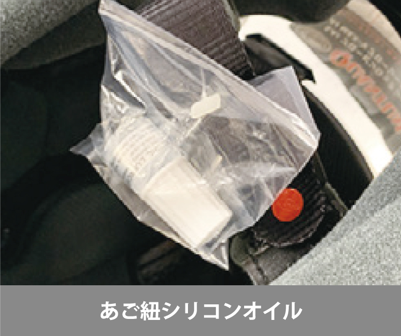 取り扱い説明書、ヘルメットガイドブックが化粧箱に同梱されています。また、シリコンオイルがあご紐に取り付けてあります。